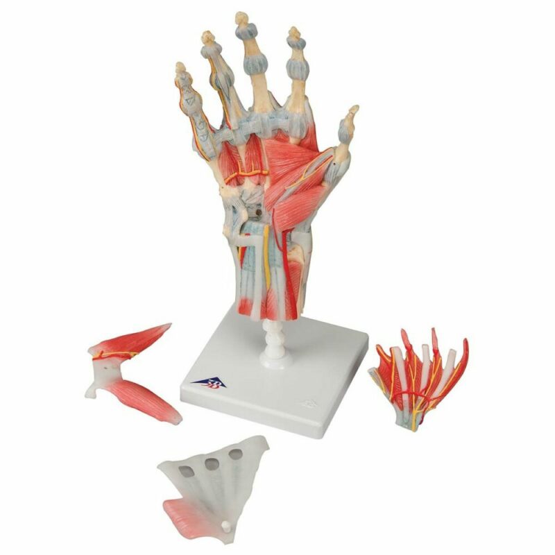 The bones, muscles, tendons, ligaments, nerves and arteries are all featured in this high quality 4 part model of the hand and lower forearm. The dorsal side of the hand shows the extensor muscles as well as portions of the tendons at the wrist as they pass under the extensor retunaculum. The palmar face of the hand is represented in three layers, the first two are removable to allow detailed study of the deeper anatomical layer of the hand. In addition clinically important structures such as the median nerve and superficial palmar arterial arch can be explored in detail in the hand model. The deepest anatomical layer allows for study of the intrinsic muscles and deep palmar arterial arch in addition to other details of the anatomy of the hand. This high quality anatomically correct hand model with ligaments and muscles is great for detailed study.