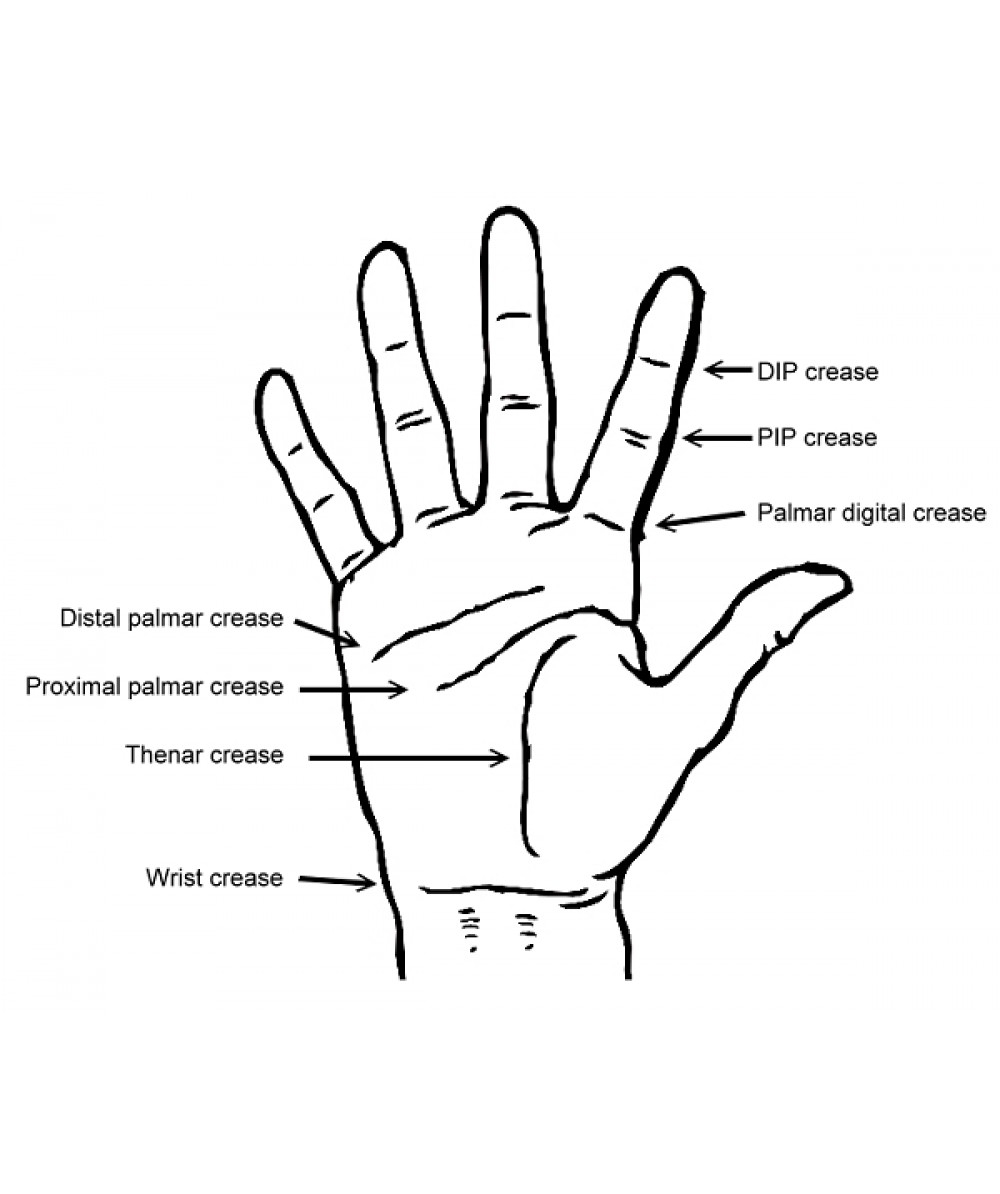This design provides extension to the PIP and a mild extension effect to the MCP. Leaves the DIP completely free. The pressure is attributed by the dorsal pad. The spring can be adjusted individually. The force is approx. 2.3N in 15 degrees of flexion. Sizing: Measure distance from distal palmar crease to DIP joint crease – see image for location of these joints if unsure. X-Small 2-1/4″ Small 2-5/8″ Medium 3″ Large 3-1/2″ X-Large 4″